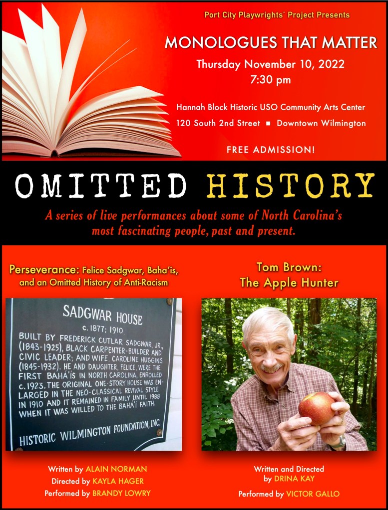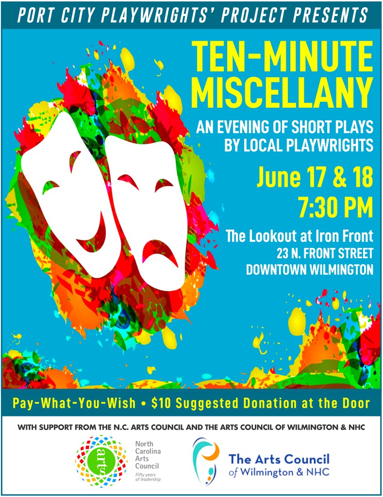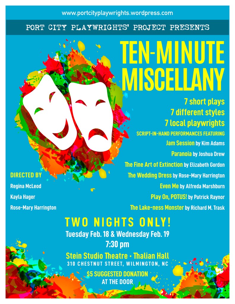 PCPP presented Ten-Minute Miscellany on Feb. 18-19, 2020 at the Stein Studio Theatre in historic Thalian Hall. We were stunned by the massive audience turn-out. Tuesday was close to capacity, and on Wednesday we added an extra row of seats in front, as well as to the side, and we still had to turn people away! Clearly, there is a demand for original programming such as this.