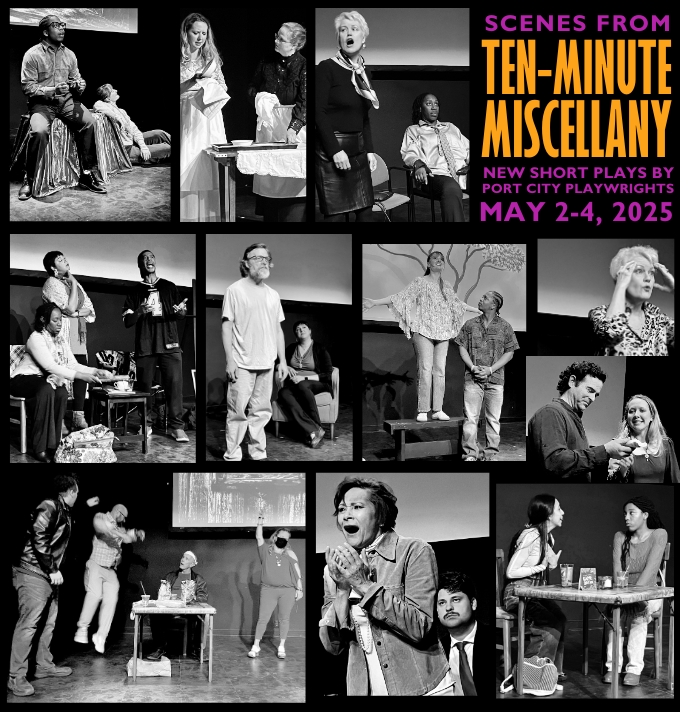 As a writers’ group, Port City Playwrights meets regularly to read and provide feedback on each other’s scripts. We also showcase members’ work by producing short films and stage plays. Our signature offering is Ten-Minute Miscellany, which presents several short plays by different PCP writers and has been a perennial audience favorite since 2020. Stay tuned for information about our upcoming Miscellany in 2026.