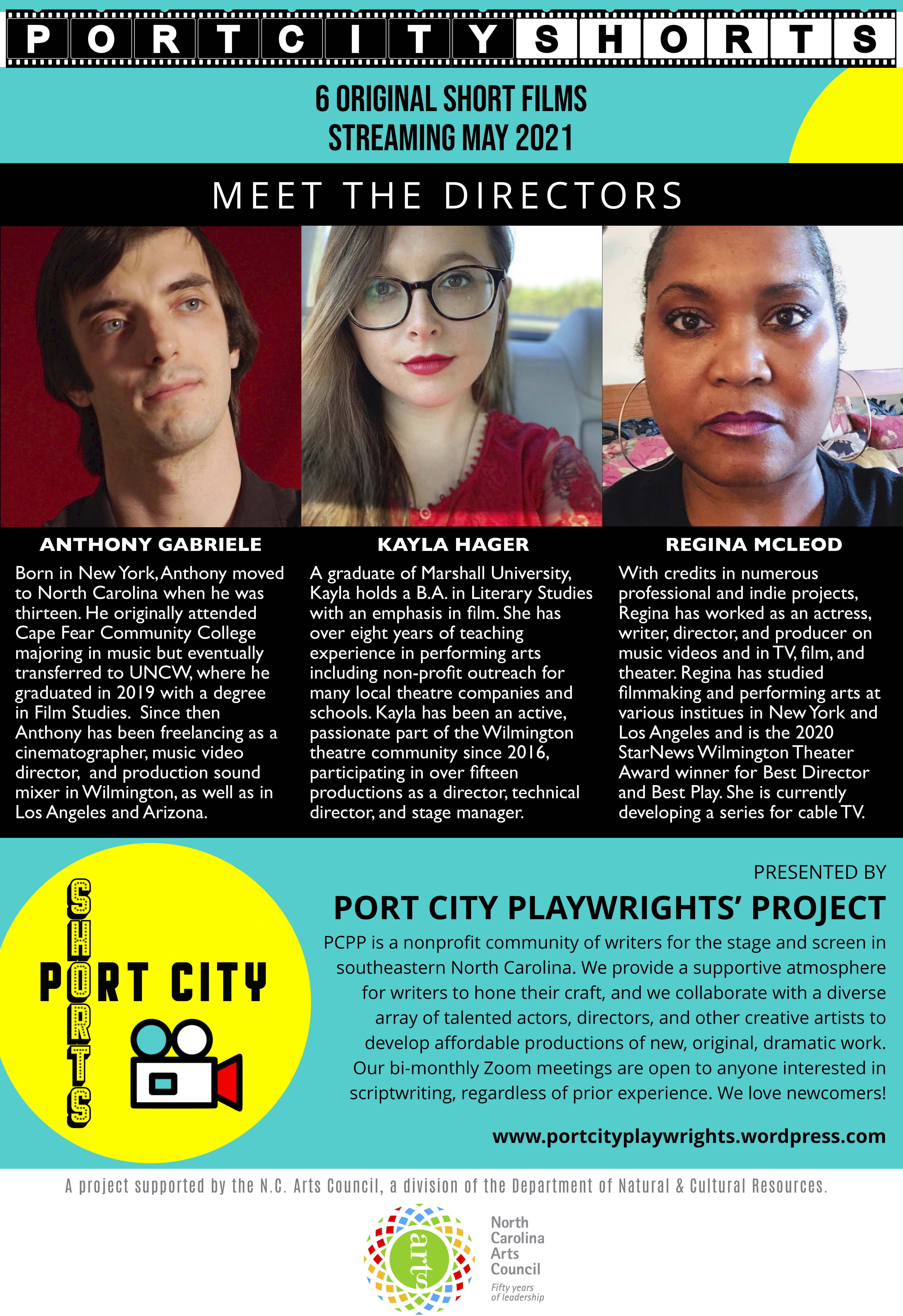 Port City Shorts was PCPP’s first-ever showcase of original short films. Penned by PCPP writers, selected by the directors in February, cast and shot in March and April, it streamed May 21 – June 12, 2021.