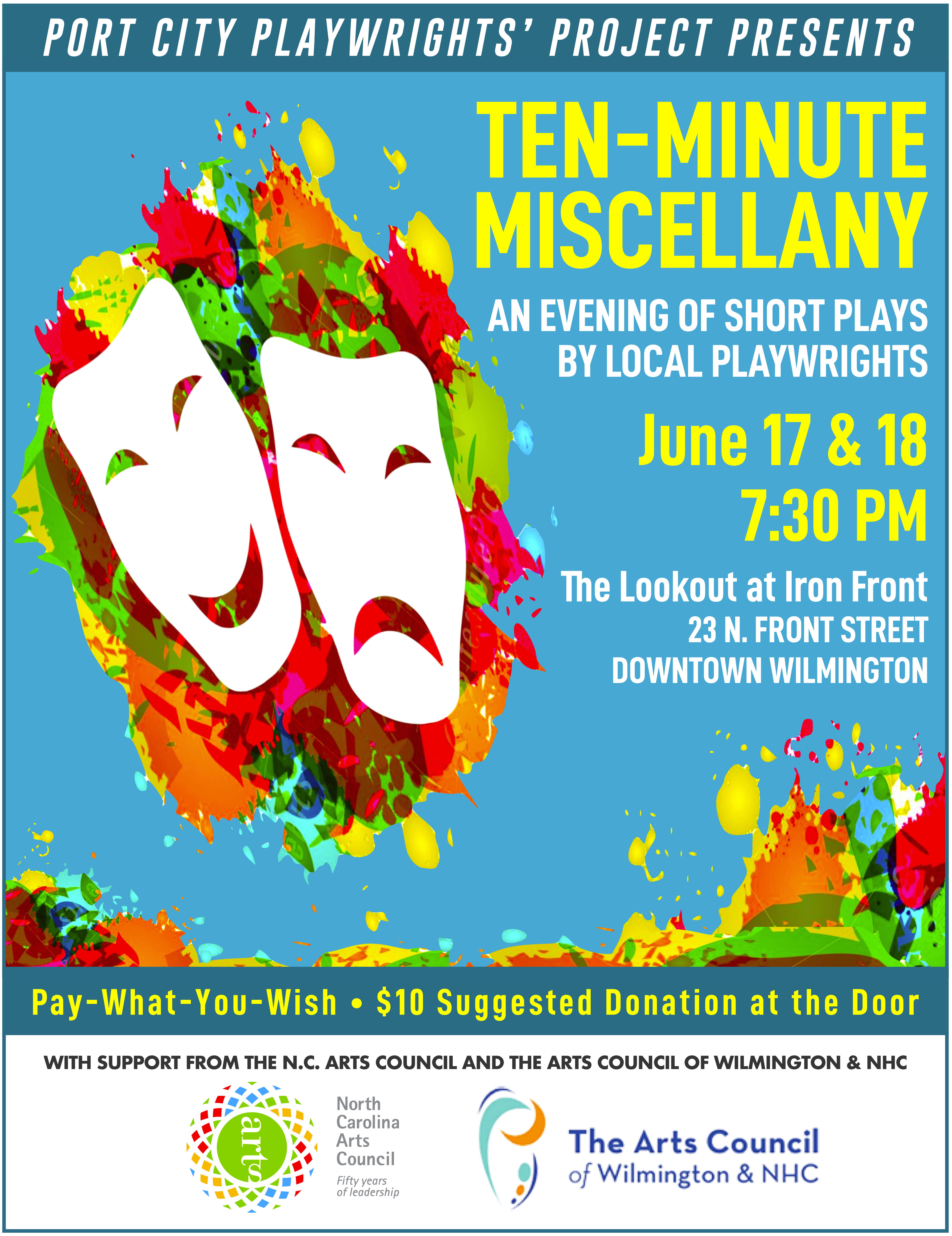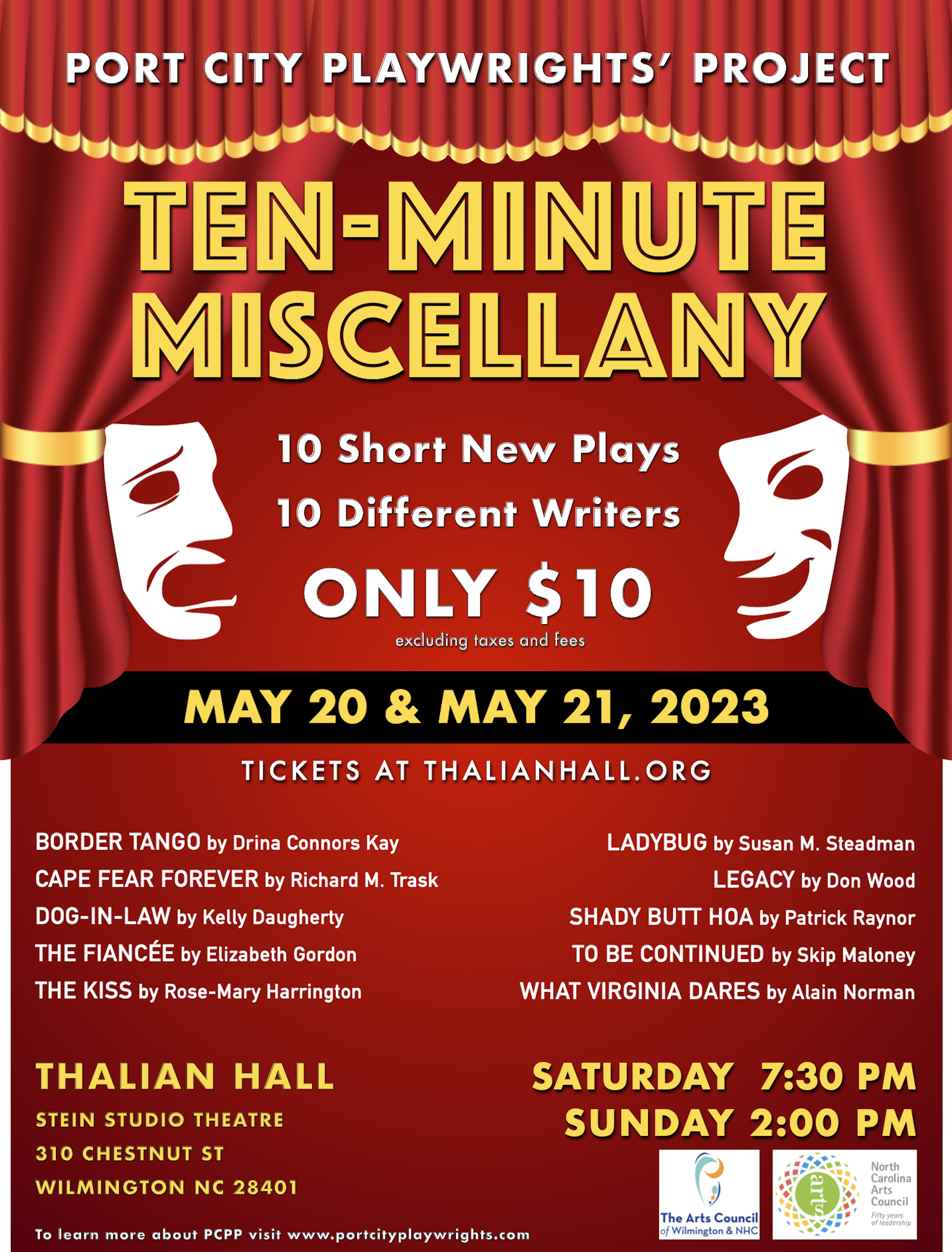 PCPP presented Ten-Minute Miscellany on Feb. 18-19, 2020 at the Stein Studio Theatre in historic Thalian Hall. We were stunned by the massive audience turn-out. Tuesday was close to capacity, and on Wednesday we added an extra row of seats in front, as well as to the side, and we still had to turn people away! Clearly, there is a demand for original programming such as this.