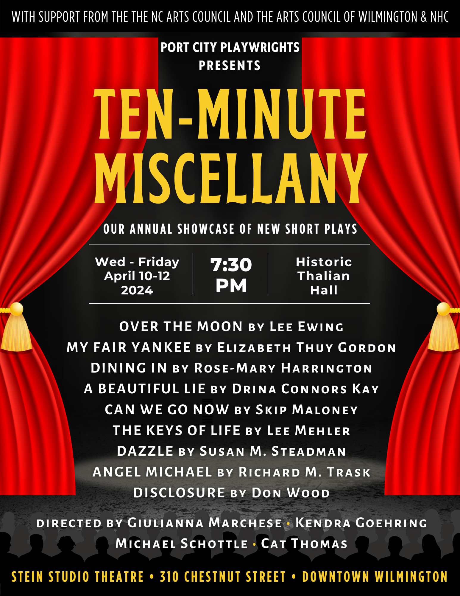 PCP proudly made its Brunswick County debut in November 2024 at Southport’s Brunswick Little Theatre. Best of 10-Minute Miscellany reprised nine of our most popular plays from the past three years, plus a brand-new one. Audiences came out in droves to enjoy this entertaining, fast-paced theatrical smorgasbord, with a 99% sell-out over three days.